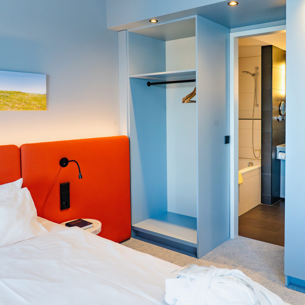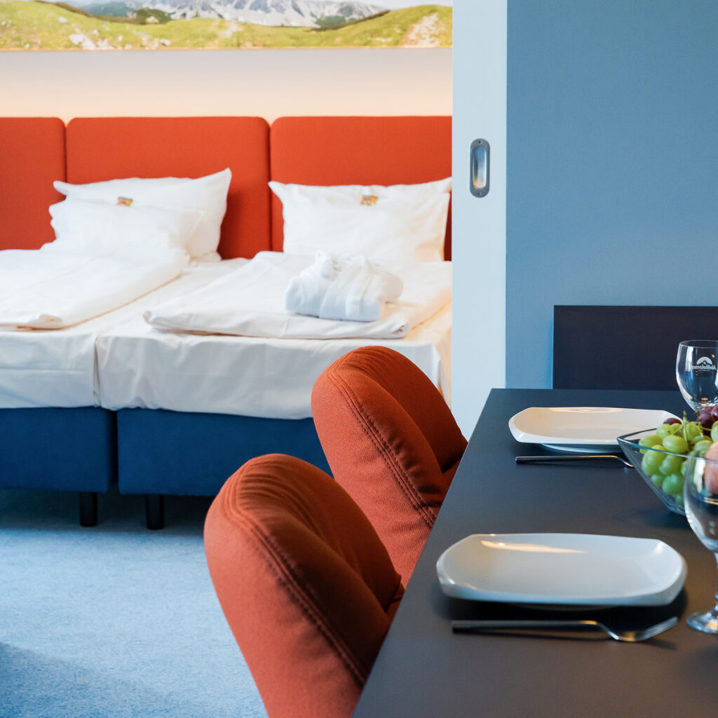 Freundliches Zimmer im obersten Stockwerk, nah an den Wellnessbereichen. Inkl. Bademäntel und -Slipper, Kühlschrankfüllung, viel Platz, Sky-Sport & Smart-TV, extralangen Betten, Kitchenette, Arbeitsplatz, WLAN&LAN, Sofa oder Sessel, Safe, Badewanne u.v.m.