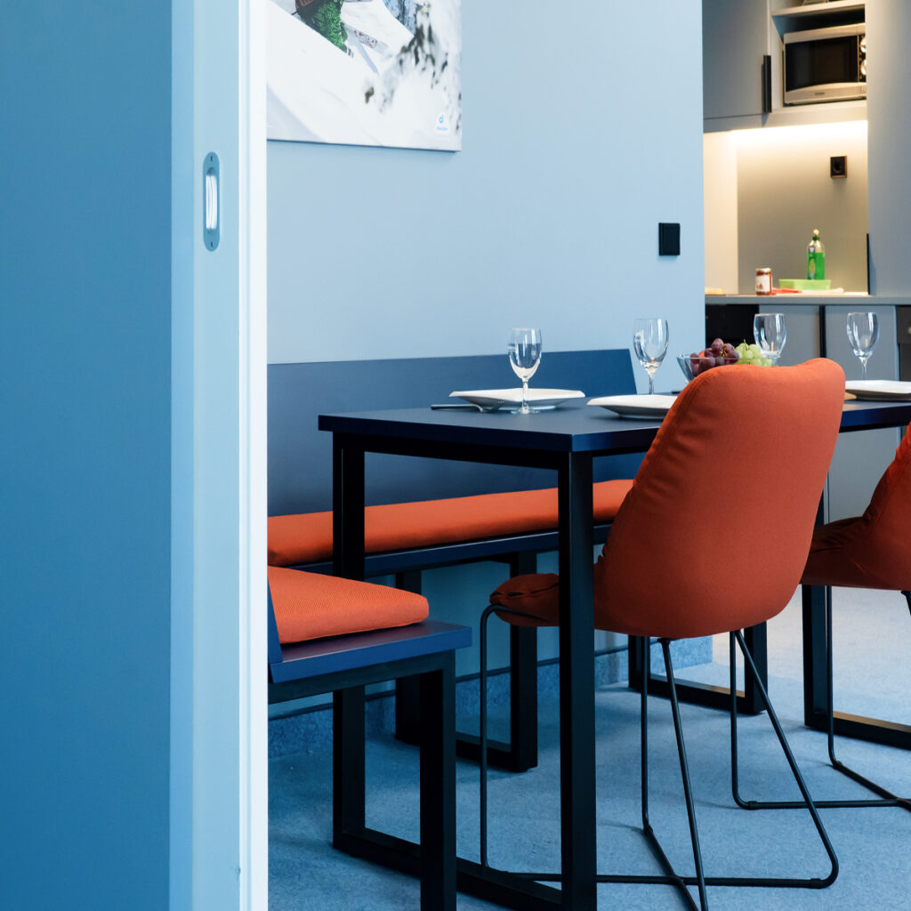 Der clevere Grundriss und die variable Möblierung machen aus dem 3-Raum-Apartment mit 72 m² für unsere Geschäftskunden eine funktionale Konferenzeinheit und für unsere Familiengäste eine geräumige Urlaubswohnung.