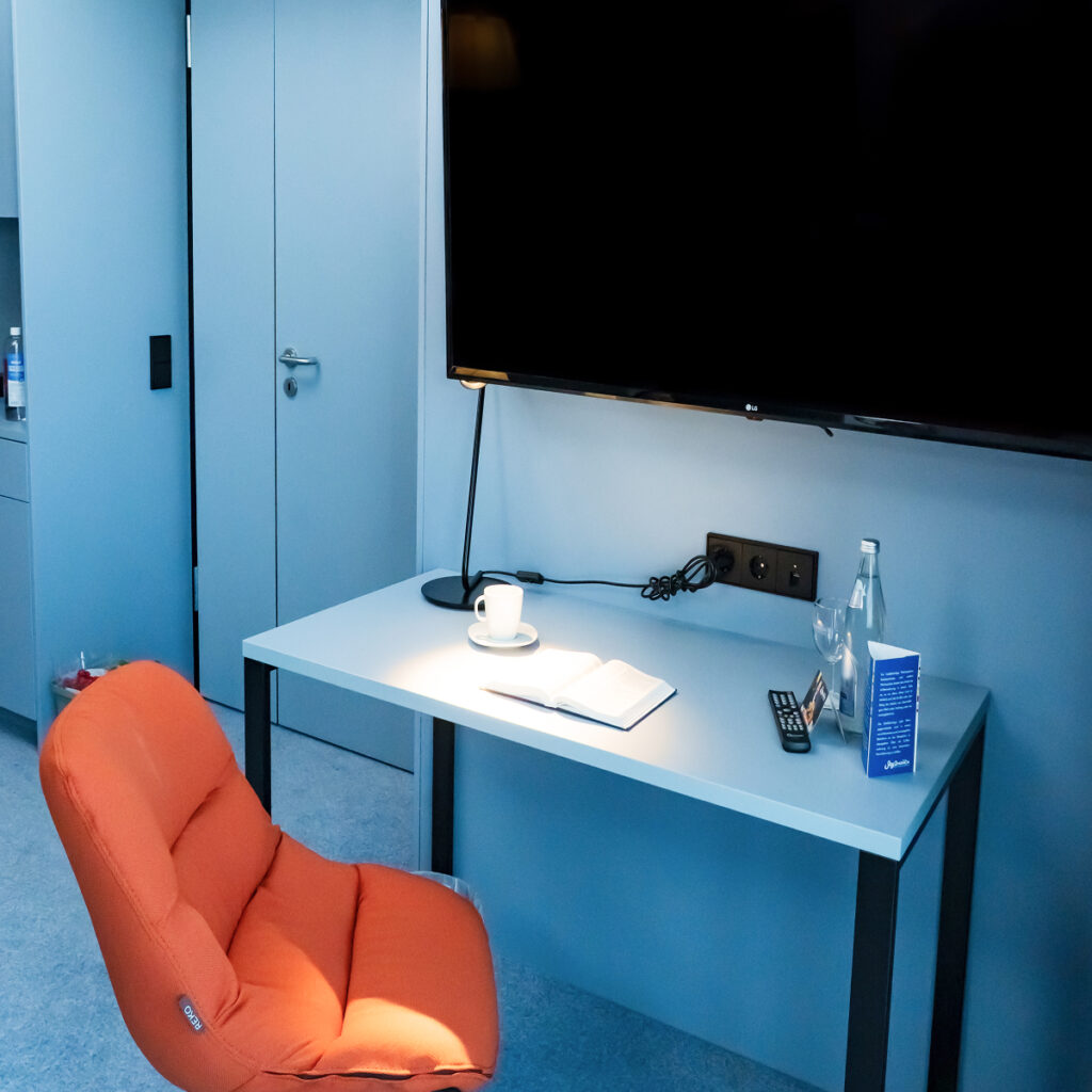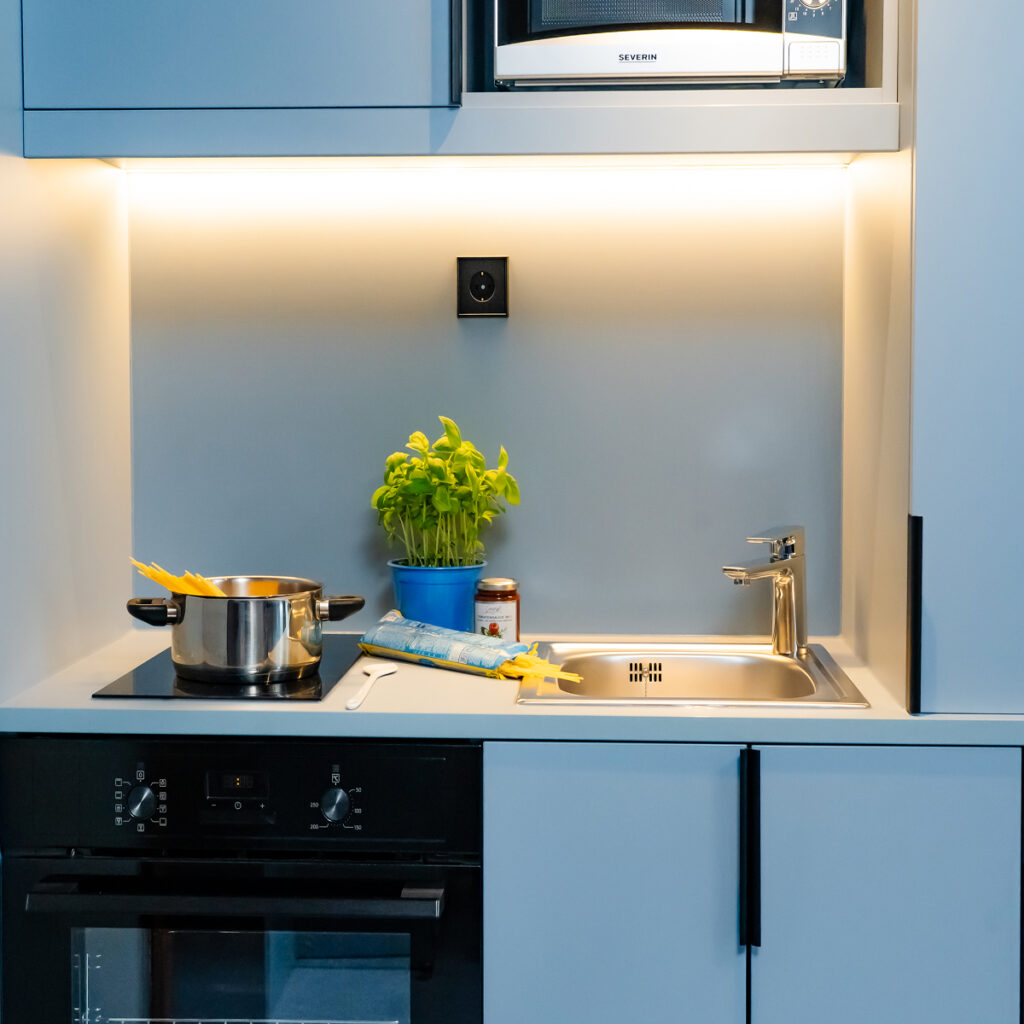 Die 2-Zimmer-Apartments sind ausgestattet mit separatem Schlafzimmer mit zwei großen Betten (je 90 x 210 cm), Kleiderschrank und Flatscreen-TV, Wohn-, Ess- und Arbeitsbereich, 2 Balkonen, einer Badewanne, einem Föhn, einem großzügigen Arbeitsbereich, LAN und WLAN, 43″ Smart-TV inkl. über 50 internationalen TV-Programmen, Sky TV und DVD-Player, Kleiderschrank, einem zusätzlichen mobilen Tisch, Sitzmöglichkeiten und Kofferablage, einer voll ausgestatteten Küche.